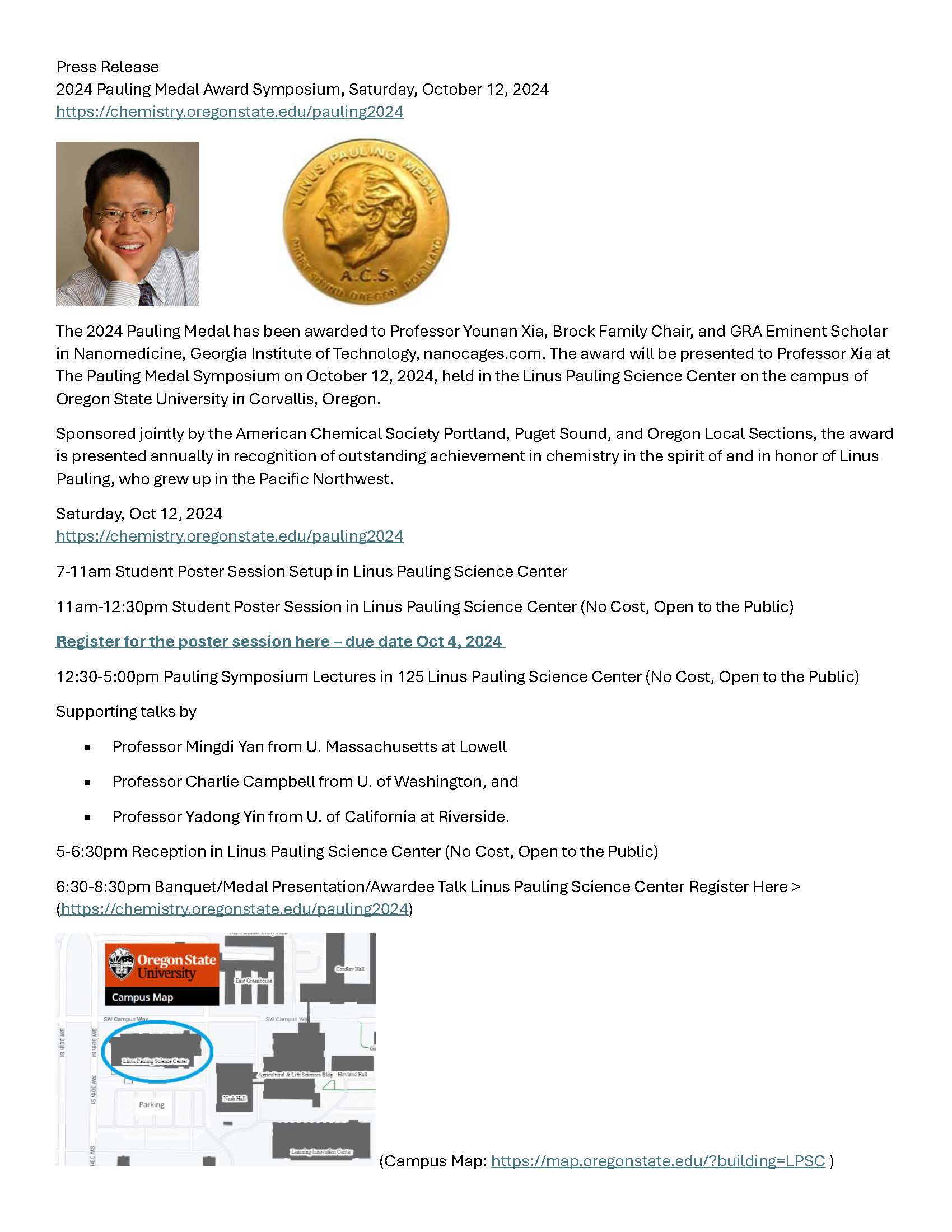 The award was presented to Professor Xia at the Pauling Medal Symposium on October 12, 2024. The symposium was held in the Linus Pauling Science Center on the campus of Oregon State University in Corvallis, Oregon.